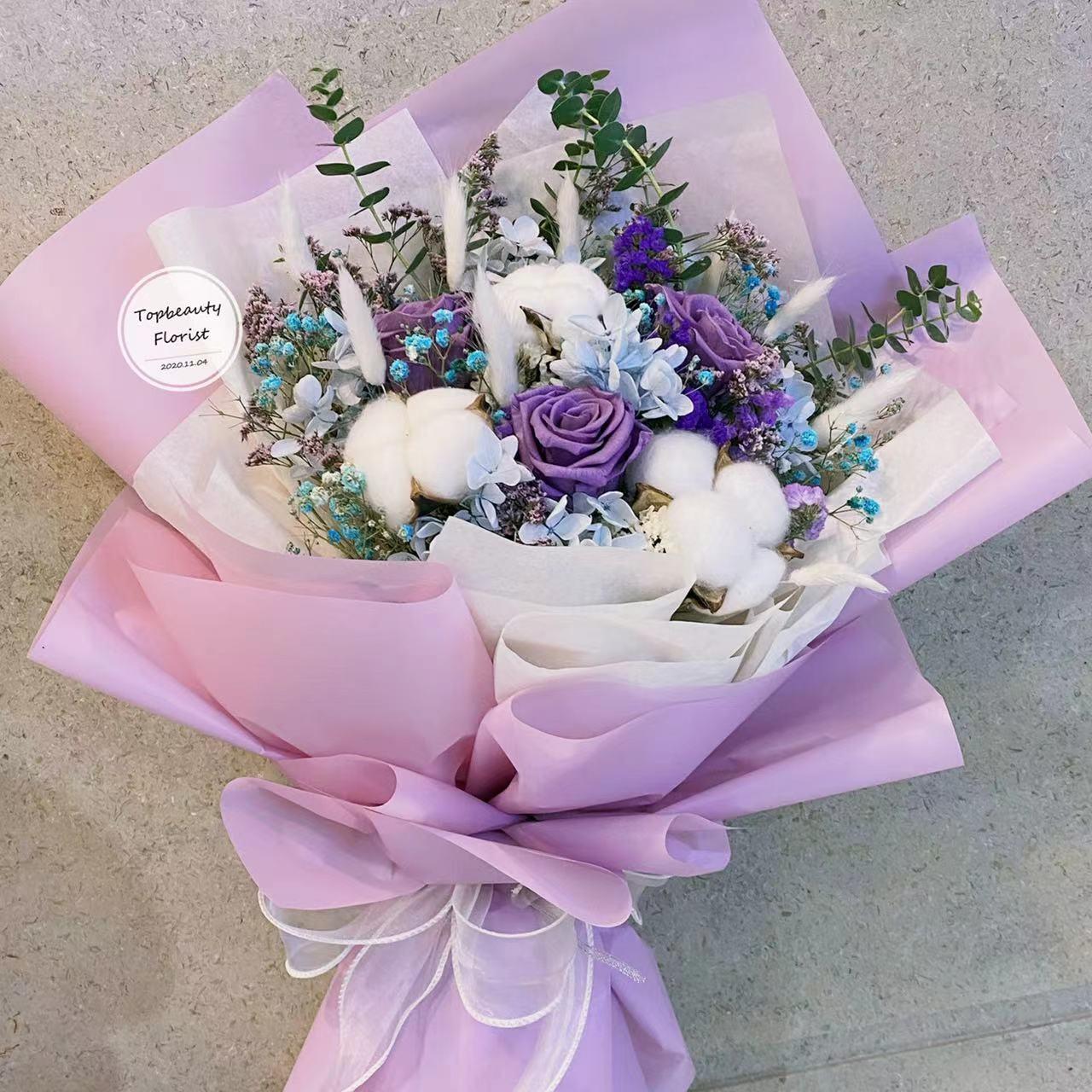 規格約:45*30cm 不包括花紙, 保鮮花束,可調整主花及花紙顏色請聯絡职員,每件花藝品由人手製作,花材屬自然產物,每枝都有其獨特的型態,及顏色的差異, 襯花及葉亦會受季節及市場供貨而有所調整, 所以圖片僅作參考