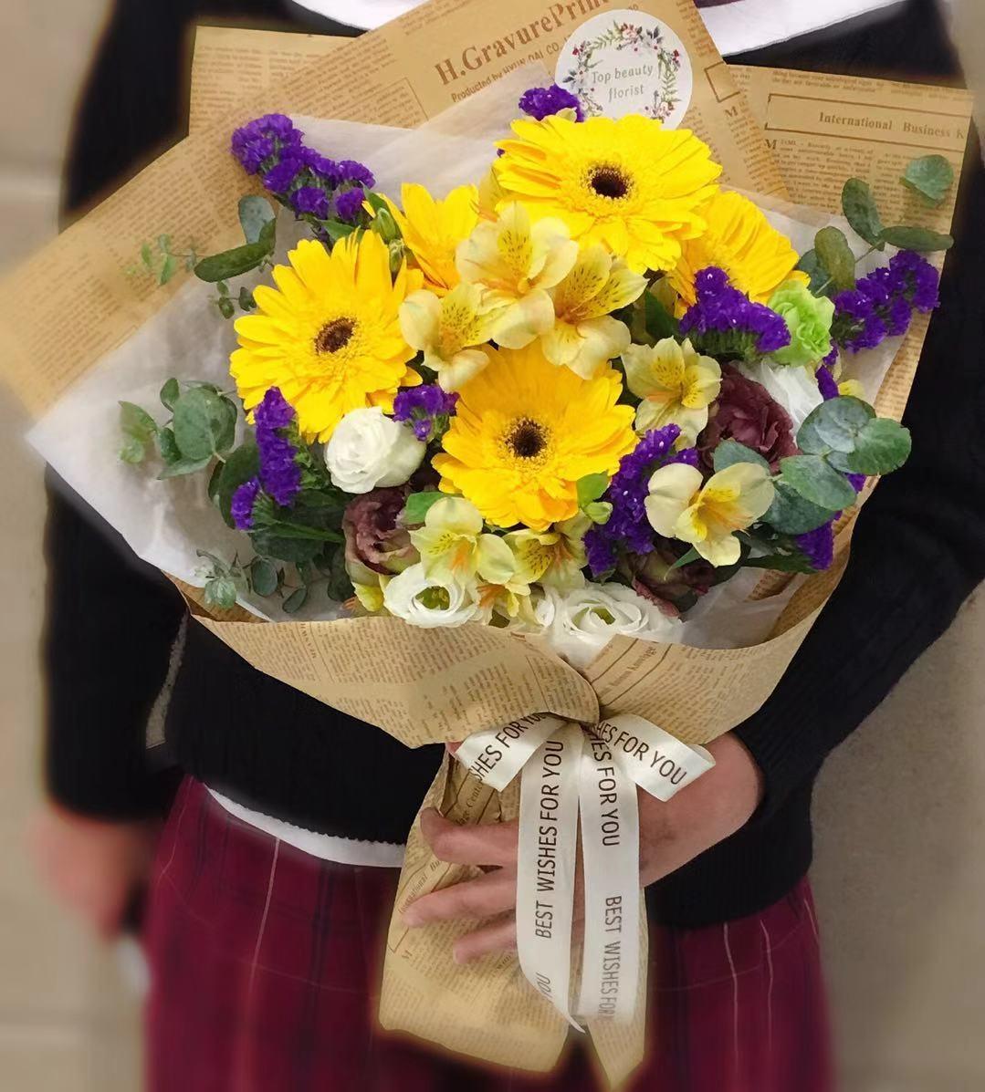 規格:48*30cm 不包括花紙, 鮮花束,可調整主花及花紙顏色請聯絡职員,每件花藝品由人手製作,鮮花材屬自然產物,每枝都有其獨特的型態,及顏色的差異, 襯花及葉亦會受季節及市場供貨而有所調整, 所以圖片僅作參考