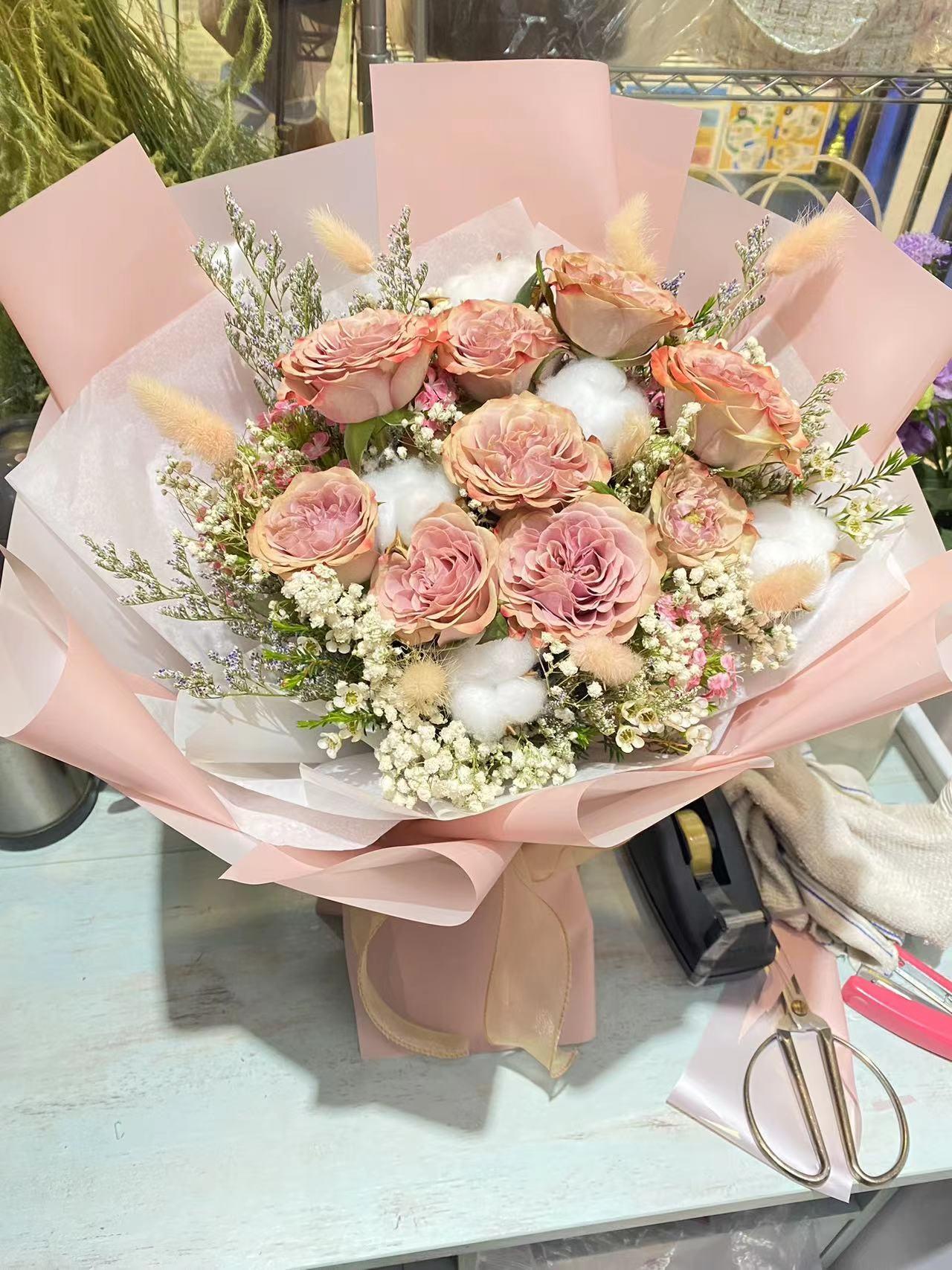 10枝卡布奇諾棉花花束(10 Roses & cotton Bouquet)